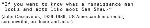 Sam Shaw (1912- 1999), native and lifelong New Yorker, shot countless cover photographs for Life and Look in the fifties and sixties, and later also took the still images for the films he produced himself. He also portrayed almost every major Hollywood star, artist, and intellectual of his day, consistently capturing the perfect moment, sometimes as if he were selecting the camera angle for a film sequence.